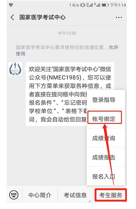 完成注冊后,關(guān)注微信公眾號“國家醫(yī)學(xué)考試中心”—>點(diǎn)擊“考生服務(wù)”菜單,找到“綁定帳號”—>會跳轉(zhuǎn)到“綁定賬號”頁面,輸入國家醫(yī)學(xué)考試考生服務(wù)系統(tǒng)帳號(用戶名)及密碼進(jìn)行綁定即可。如果已經(jīng)進(jìn)行過綁定的用戶則會直接跳轉(zhuǎn)到“綁定成功”頁面。