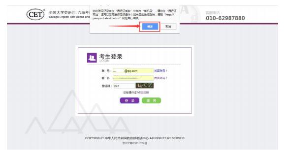 4、若賬號(hào)還沒有在“通行證系統(tǒng)中”綁定過手機(jī)號(hào),則需要到“通行證網(wǎng)址”填寫以后再進(jìn)行登錄報(bào)名,請(qǐng)到“http://passport.etest.net.cn”網(wǎng)址完成手機(jī)號(hào)綁定操作。點(diǎn)擊“確定”