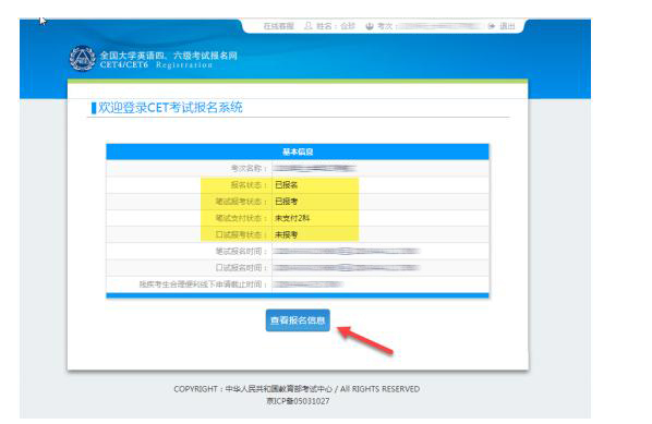 可看到報(bào)名流程的進(jìn)度:已完成筆試報(bào)考,可直接在下方進(jìn)行繳費(fèi)。也可在頁面中間部分繼續(xù)選擇“口試報(bào)考”;或“CET6資格復(fù)核”: