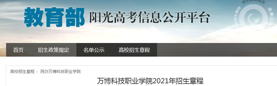 從教育部陽光高考信息公開平臺獲悉,萬博科技職業(yè)學院2021年招生章程已公布,具體詳情如下: