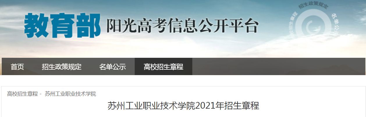 從教育部陽光高考信息公開平臺獲悉,蘇州工業(yè)職業(yè)技術(shù)學(xué)院2021年招生章程已公布,具體詳情如下: