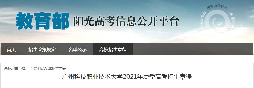從教育部陽光高考信息公開平臺獲悉,廣州科技職業(yè)技術大學2021年夏季高考招生章程已公布,具體詳情如下: