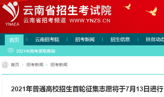 高考頻道從云南省招生考試院了解到,2021年云南普通高校招生首輪征集志愿于7月13日進(jìn)行,具體如下: