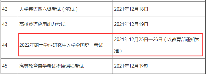 考研頻道根據(jù)貴州省招生考試院公布的《2021年貴州省招生考試院各項(xiàng)考試時(shí)間安排》了解到,黑龍江考研時(shí)間2022具體時(shí)間安排已確定,黑龍江考研時(shí)間安排在2021年12月25日-26日期間(以教育部通知為準(zhǔn))。具體如下: