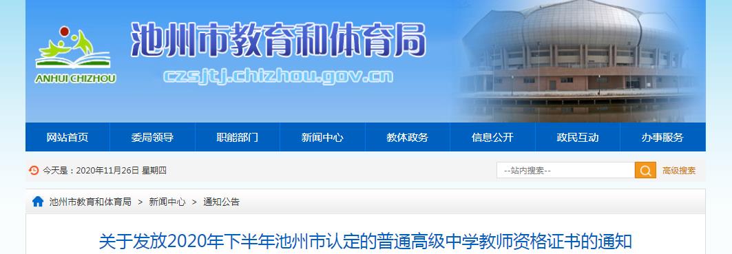 從池州市教育和體育局獲悉,2020年下半年安徽池州市普通高級中學(xué)教師資格證書發(fā)放通知已公布,證書領(lǐng)取時間為11月26日-27日,具體詳情如下: