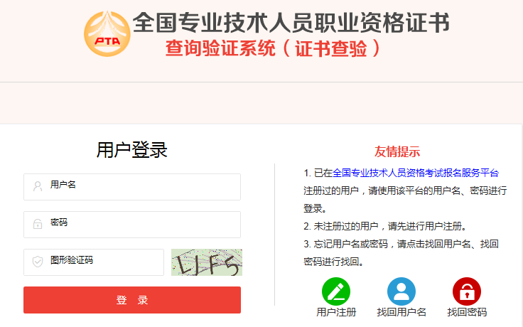 已在中國人事考試網(wǎng)“全國專業(yè)技術(shù)人員資格證書查詢驗證系統(tǒng)”或“全國專業(yè)技術(shù)人員資格考試報名服務(wù)平臺”注冊過的查詢?nèi)藛T,請直接登錄。