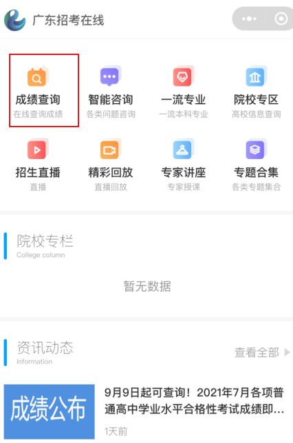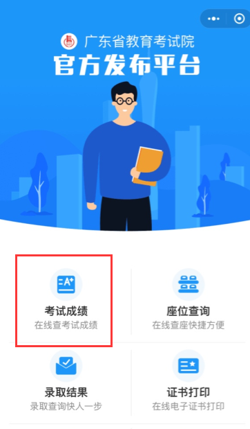 考生于9月9日10:00起,考生可微信搜索進(jìn)入“廣東招考在線”小程序,點(diǎn)擊“成績查詢”,選擇考生對應(yīng)的考試類別,通過考生號和出生日期查詢考試成績;