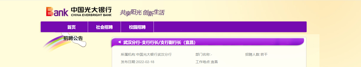 2022光大銀行湖北武漢分行(宜昌)社會招聘若干人,報(bào)名時(shí)間:即日起至2022年12月31日,現(xiàn)將招聘詳情發(fā)布如下: