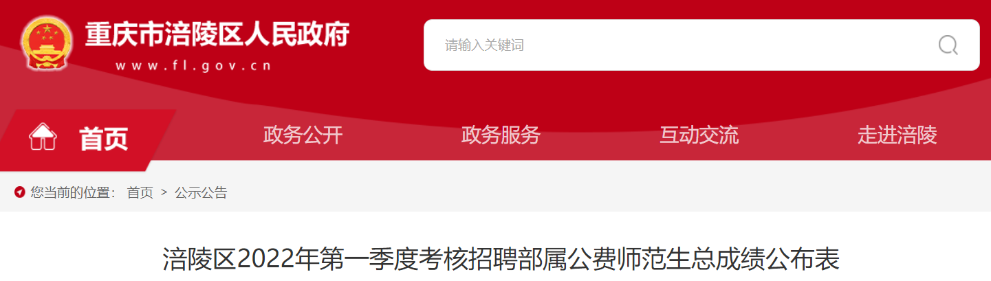 2022年第一季度重慶涪陵區(qū)考核招聘部屬公費師范生總成績公布表已發(fā)布,現(xiàn)將原文發(fā)布如下:
