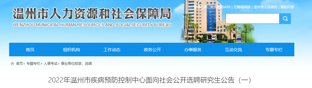 2022浙江溫州市疾病預(yù)防控制中心面向社會選聘研究生9人,報名時間:2022年3月8日截止,現(xiàn)將招聘公告原文發(fā)布如下: