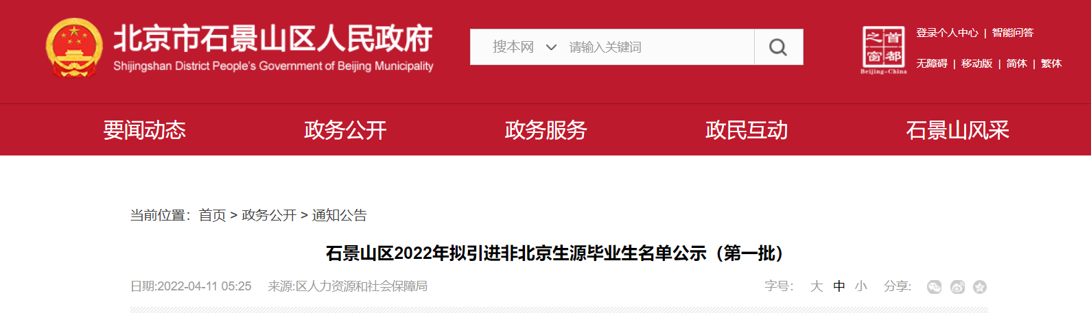為廣泛接受社會監(jiān)督,確保引進畢業(yè)生工作信息公開、過程公開、結(jié)果公開,根據(jù)北京市人力社保局相關(guān)工作要求,現(xiàn)將石景山區(qū)2022年擬引進非北京生源畢業(yè)生名單(第一批)予以公示。