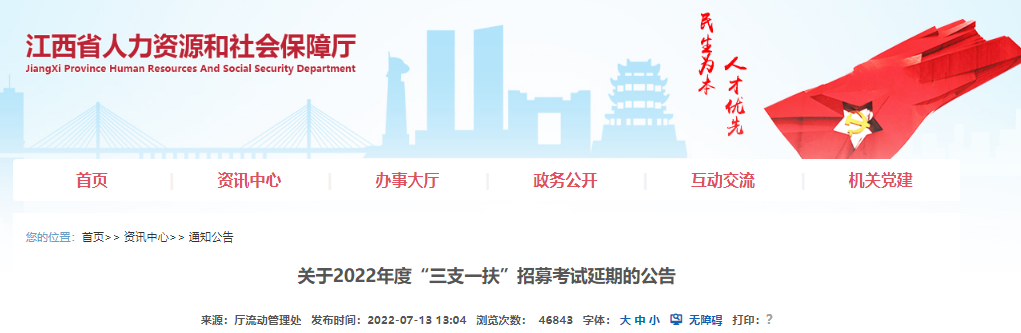 原定于7月17日進(jìn)行的2022年度“三支一扶”招募考試因故延期,筆試重啟時(shí)間和打印準(zhǔn)考證時(shí)間另行通知。