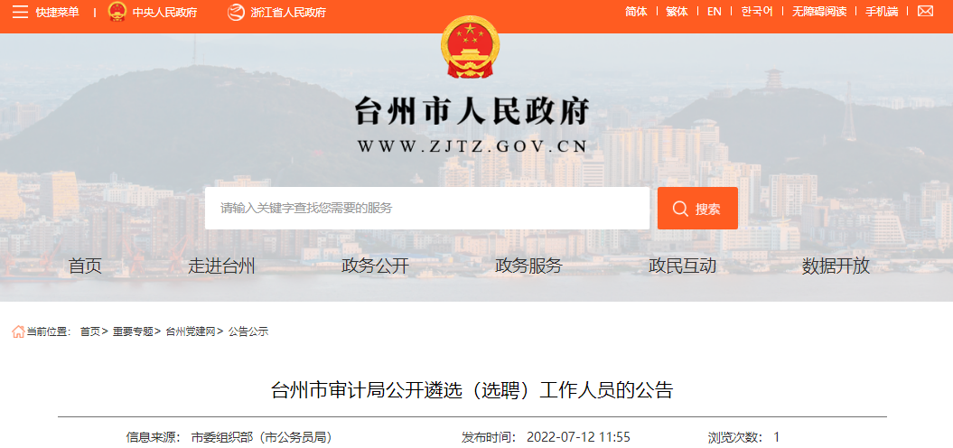 2022年浙江臺(tái)州市審計(jì)局公開遴選(選聘)工作人員公告已公布,為了方便廣大考生的查閱,下面為您詳細(xì)介紹一下本次遴選(選聘)工作人員的具體事宜,希望廣大考生及時(shí)關(guān)注,如有相關(guān)疑問,請(qǐng)關(guān)注遴選考試頻道為您實(shí)時(shí)做出的更新。