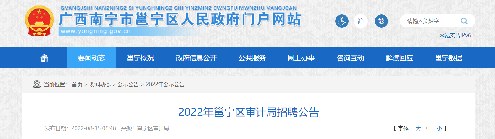 2022廣西南寧市邕寧區(qū)審計局招聘公告已發(fā)布。報名時間:2022年8月15日—8月26日,現(xiàn)將招聘公告原文發(fā)布如下: