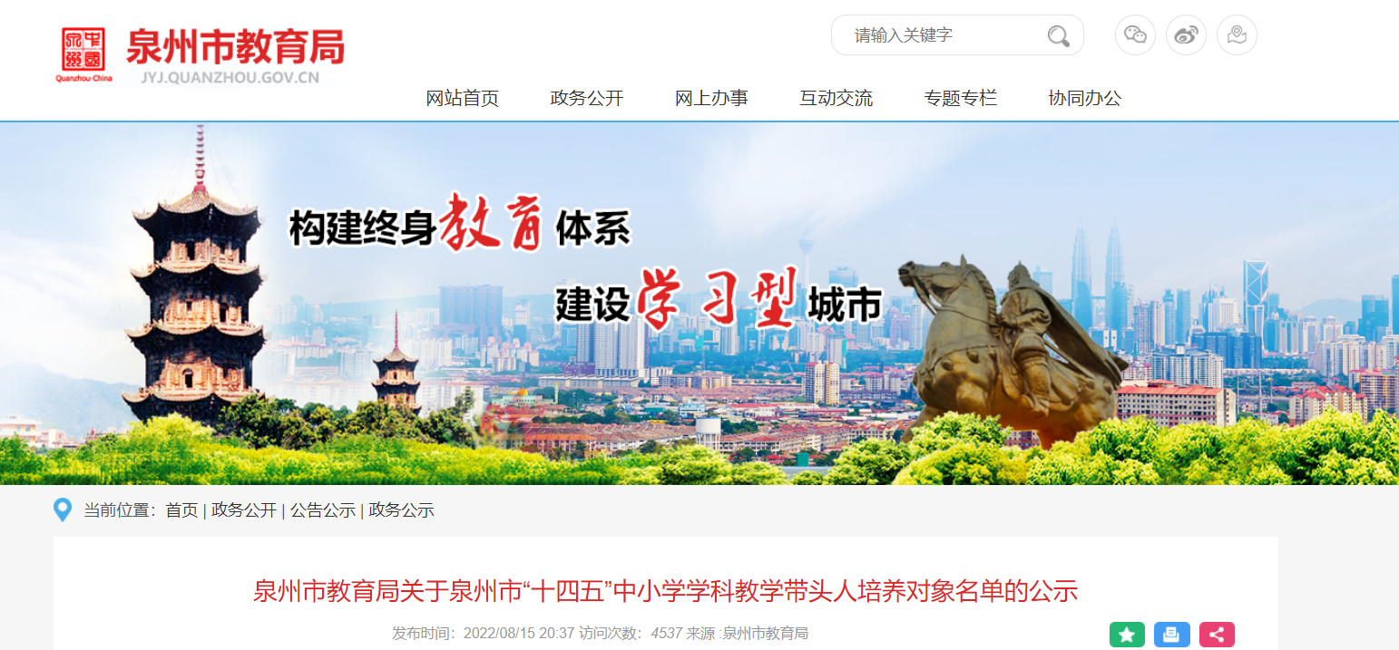 關(guān)于福建省泉州市“十四五”中小學(xué)學(xué)科教學(xué)帶頭人培養(yǎng)對象名單的公示已發(fā)布。公示時間:2022年8月15日-2022年8月19日。為您整理了以下內(nèi)容,供您參考。