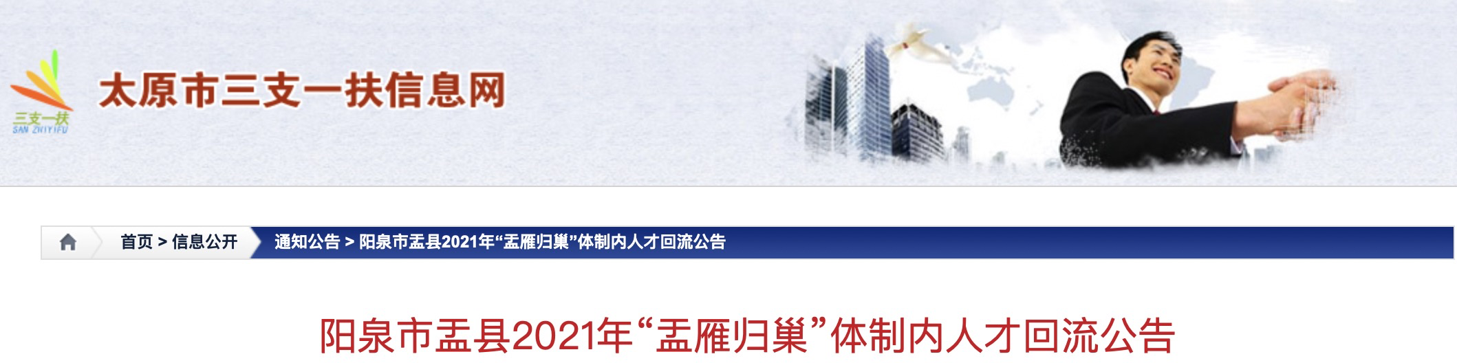2021年山西陽(yáng)泉市盂縣“盂雁歸巢”體制內(nèi)人才回流公告已發(fā)布,報(bào)名時(shí)間為:2021年9月9日——24日,現(xiàn)將招聘公告原文發(fā)布如下:
