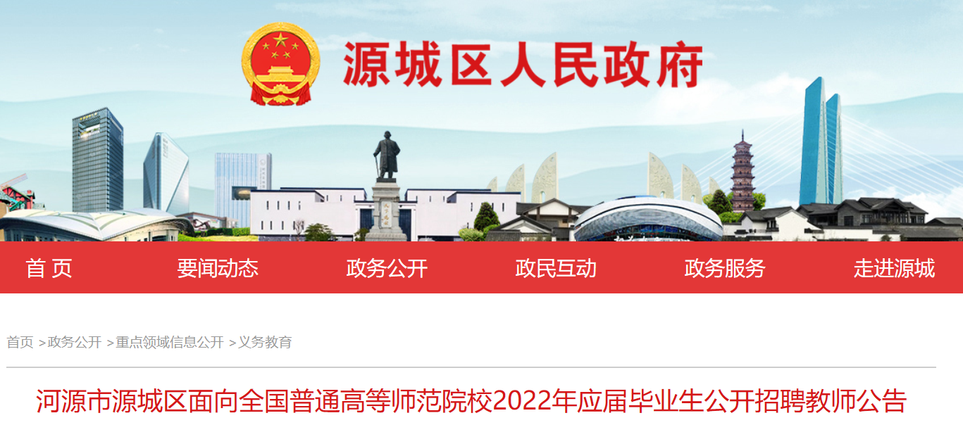 為適應(yīng)源城區(qū)教育事業(yè)發(fā)展的需要,充實(shí)師資隊(duì)伍,優(yōu)化師資結(jié)構(gòu),根據(jù)《廣東省事業(yè)單位公開(kāi)招聘人員辦法》(省政府令第139號(hào))等文件規(guī)定,我區(qū)決定面向全國(guó)普通高等師范院校2022年應(yīng)屆畢業(yè)生公開(kāi)招聘一批中小學(xué)教師。具體公告如下: