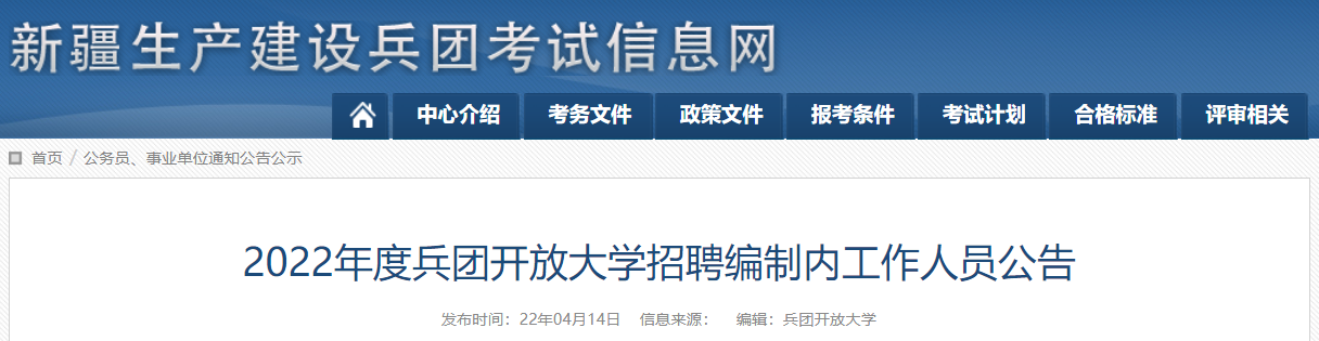 2022新疆兵團開放大學招聘編制內人員15人,報名時間:2022年4月14日10:00至4月24日18:00。現將招聘公告原文發(fā)布如下:
