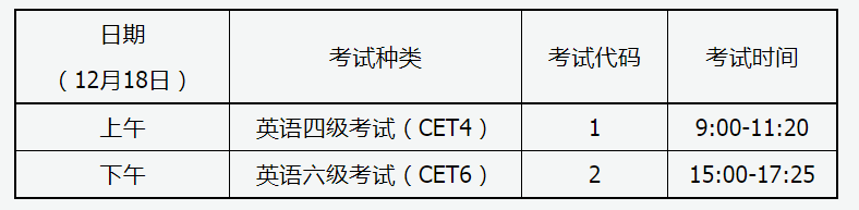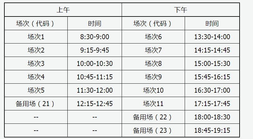 英語(yǔ)四級(jí)口語(yǔ)考試(CET-SET4)考試時(shí)間為11月20日(F213次),英語(yǔ)六級(jí)口語(yǔ)考試(CET-SET6)考試時(shí)間為11月21日(S214次),具體場(chǎng)次安排如下: