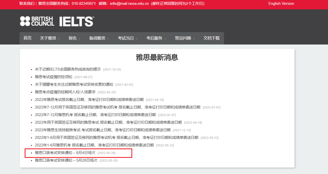 接英國文化教育協(xié)會(huì)通知,報(bào)考2022年6月4日雅思考試的考生口語安排如下,供廣大考生參考。請(qǐng)按照?qǐng)?bào)名網(wǎng)站公布的準(zhǔn)考證打印時(shí)間登錄雅思考試報(bào)名網(wǎng)站查詢您的口試安排,打印準(zhǔn)考證并以準(zhǔn)考證信息為準(zhǔn)。考試類型:雅思考試