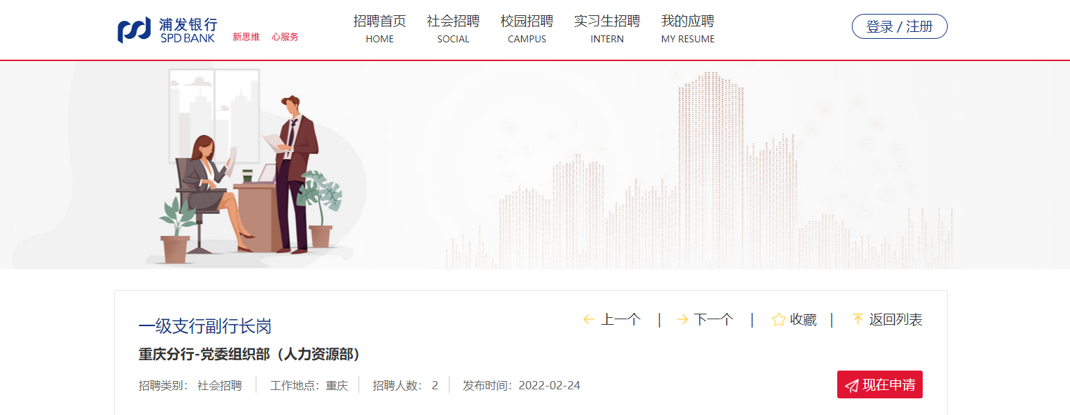 2022浦發(fā)銀行重慶分行一級(jí)支行副行長(zhǎng)崗、市場(chǎng)經(jīng)理崗社會(huì)招聘4人,報(bào)名申請(qǐng)入口已開(kāi)通,現(xiàn)將招聘詳情發(fā)布如下:
