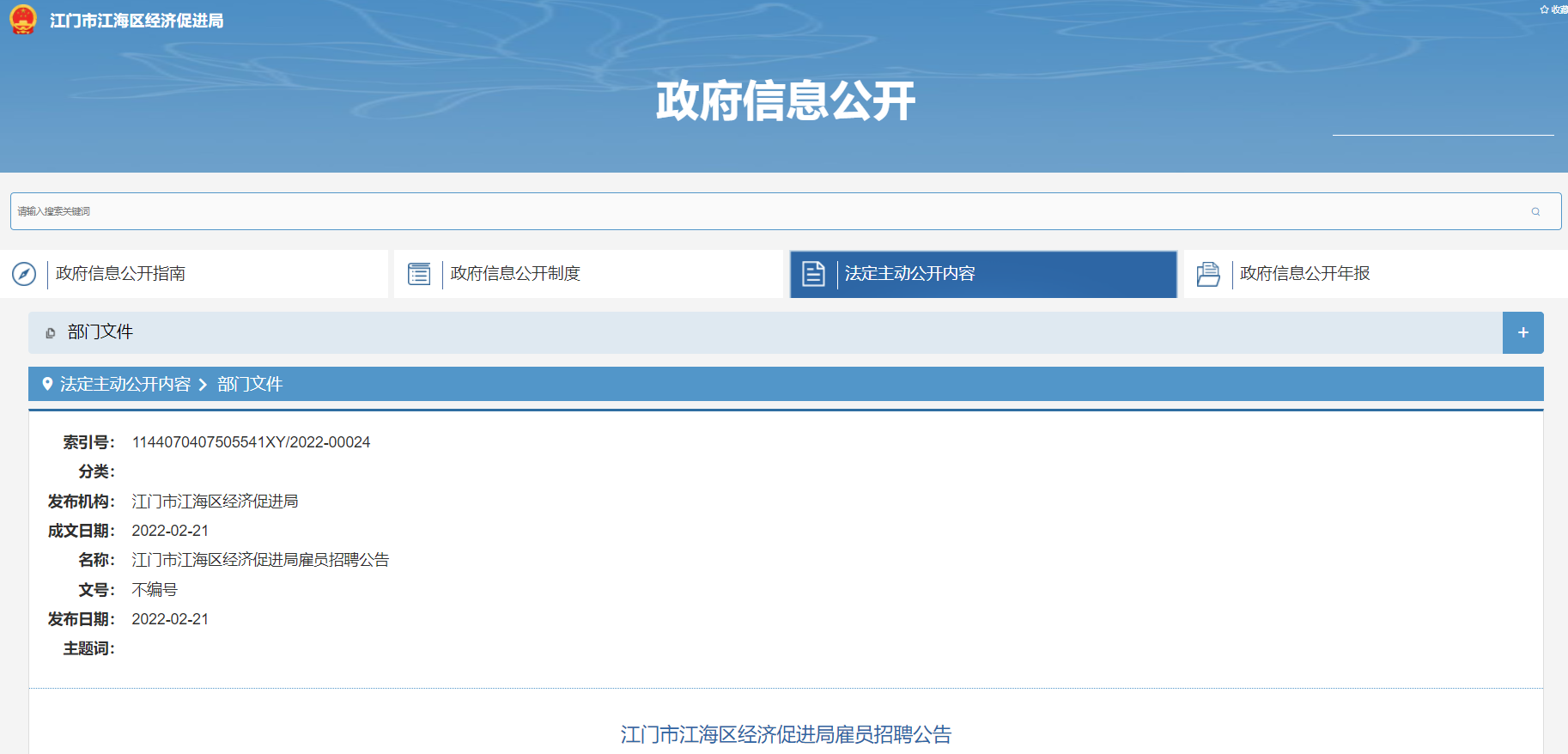 2022廣東省江門市江海區(qū)經(jīng)濟(jì)促進(jìn)局雇員招聘公告【10人】已發(fā)布。報(bào)名時(shí)間公告發(fā)布之日起至2022年2月25日。為您整理了以下內(nèi)容,供您參考。