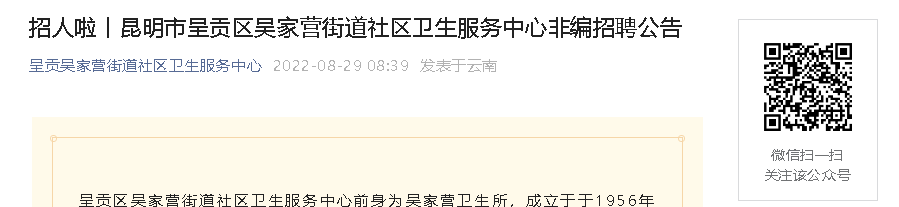 2022云南昆明市呈貢區(qū)吳家營(yíng)街道社區(qū)衛(wèi)生服務(wù)中心非編招聘,報(bào)名時(shí)間:2022年8月29日至9月2日,上午8:30-11:30,下午13:00-17:00,現(xiàn)將招聘公告原文發(fā)布如下: