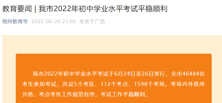 小編根據(jù)梧州市教育局發(fā)布“我市2022年初中學(xué)業(yè)水平考試平穩(wěn)順利”得知,2022年廣場梧州中考成績查詢時間預(yù)計7月10日(新通知7月9日),7月中下旬進(jìn)行考生志愿填報和高中錄取。