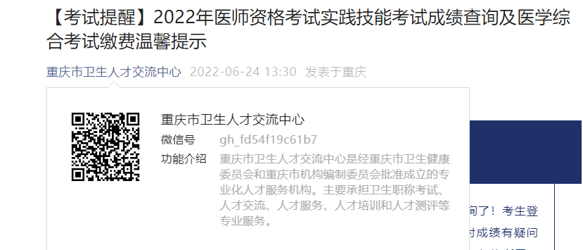 從重慶市衛(wèi)生人才交流中心公眾號獲悉,2022年重慶醫(yī)師資格考試實踐技能考試成績查詢及醫(yī)學(xué)綜合考試繳費溫馨提示已公布,請相關(guān)人員仔細閱讀,具體詳情如下: