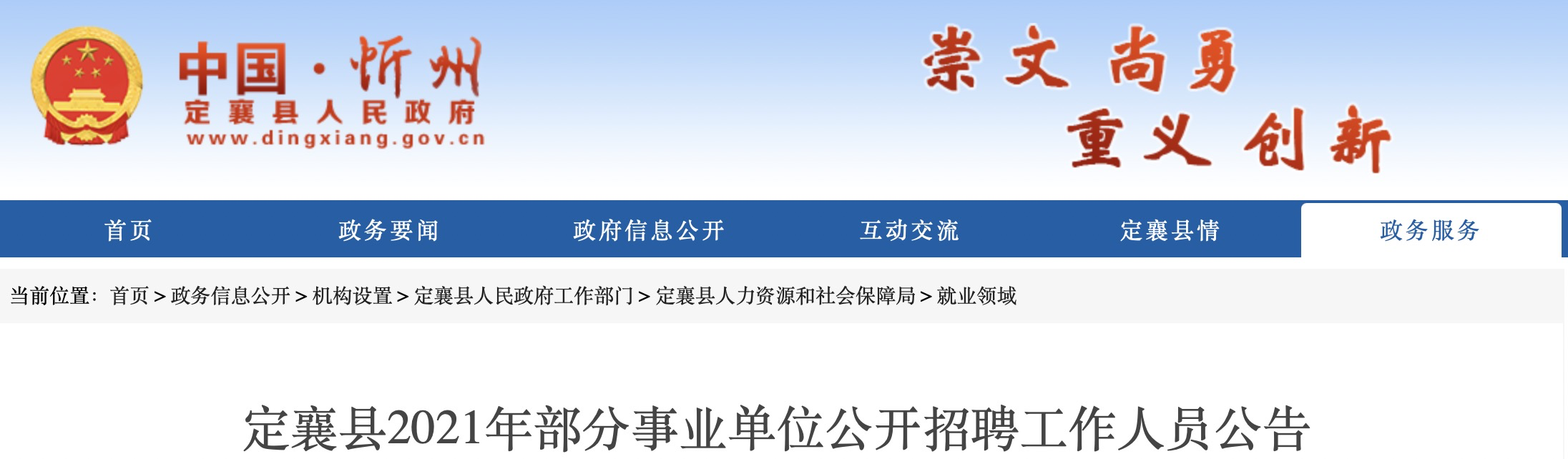 本次招聘信息通過定襄縣人民政府網(wǎng)(http://www.dingxiang.gov.cn/)、忻州市人力資源和社會(huì)保障局網(wǎng)人事考試專欄(http://rsj.sxxz.gov.cn/rsks)、山西省人社廳網(wǎng)站(http://rst.shanxi.gov.cn)發(fā)布。