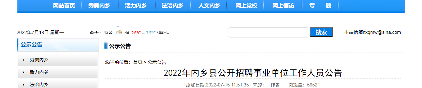 通過內(nèi)鄉(xiāng)政府網(wǎng)(www.neixiangxian.gov.cn)、內(nèi)鄉(xiāng)親民網(wǎng)(www.neixiang.gov.cn)、內(nèi)鄉(xiāng)縣人才交流中心微信公眾號(hào)等媒體向社會(huì)發(fā)布招聘公告,公告發(fā)布時(shí)間不少于七個(gè)工作日。