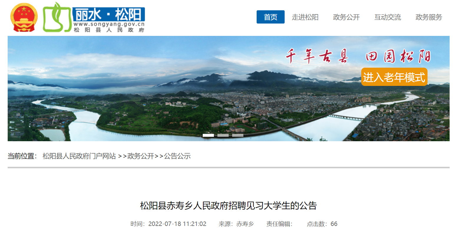 2022浙江省麗水松陽縣赤壽鄉(xiāng)人民政府招聘見習(xí)大學(xué)生公告已發(fā)布。報名時間:2022年7月19日—2022年8月1日(工作日上班時間);現(xiàn)將招聘公告原文發(fā)布如下: