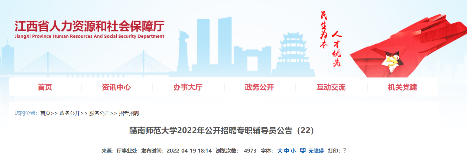 2022年江西贛南師范大學(xué)公開招聘專職輔導(dǎo)員公告已發(fā)布,報(bào)名時(shí)間:即日起至2022年5月4日17:00時(shí)止。現(xiàn)將招聘公告原文發(fā)布如下: