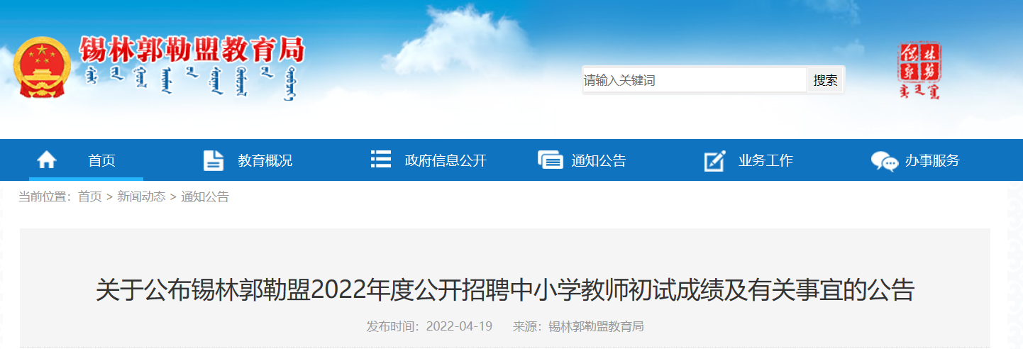 2022年度內(nèi)蒙古錫林郭勒盟公開(kāi)招聘中小學(xué)教師初試成績(jī)及有關(guān)事宜公告已發(fā)布,現(xiàn)將原文發(fā)布如下: