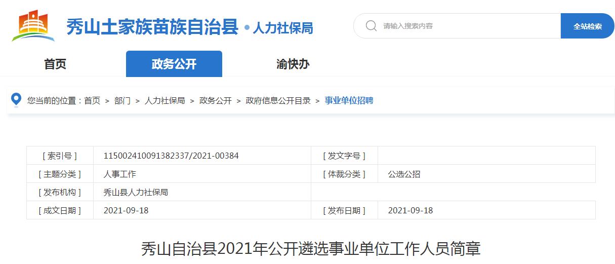 2021年重慶秀山自治縣公開(kāi)遴選事業(yè)單位工作人員簡(jiǎn)章已公布,為了方便廣大考生的查閱,下面為您詳細(xì)介紹一下本次公開(kāi)遴選事業(yè)單位工作人員工作的具體事宜,希望廣大考生及時(shí)關(guān)注,如有相關(guān)疑問(wèn),請(qǐng)關(guān)注為您實(shí)時(shí)做出的更新。