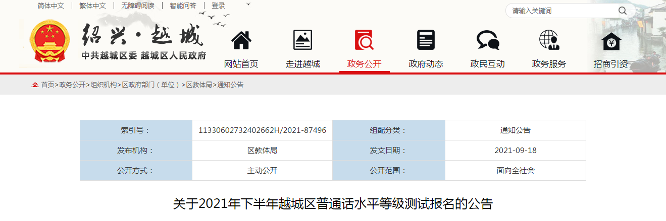 從紹興越城區(qū)人民政府發(fā)布的《2021下半年浙江紹興越城區(qū)普通話水平等級測試報名公告》得知,2021下半年浙江紹興越城區(qū)普通話考試時間及安排已公布,考試時間為11月7日左右,具體詳情如下: