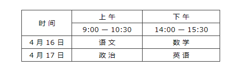 文化考試由省教育考試院按全國統(tǒng)一時(shí)間組織進(jìn)行,文化考試科目為語文、數(shù)學(xué)、政治、英語四科,每科滿分150分,四科滿分600分,使用國家通用語言文字作答。考試時(shí)間如下: