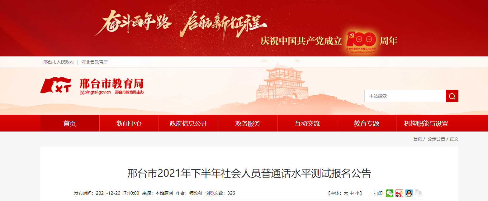 邢臺(tái)市語言文字培訓(xùn)測(cè)試站即將開始面向社會(huì)人員開展2021年度第二次普通話水平測(cè)試工作,現(xiàn)將報(bào)名工作相關(guān)事項(xiàng)公告如下: