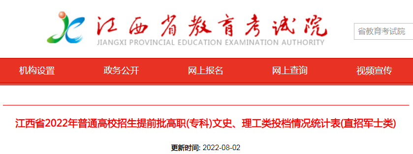 從江西省教育考試院了解到,江西省2022年普通高校招生提前批高職(???文史、理工類投檔情況統(tǒng)計(jì)表(直招軍士類)已公布,詳細(xì)內(nèi)容如下:
