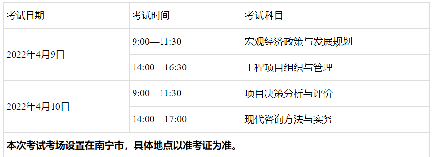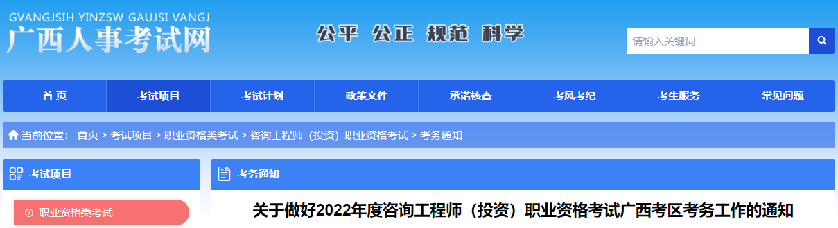 根據(jù)中國工程咨詢協(xié)會人力資源和社會保障部人事考試中心《關(guān)于做好2022年度咨詢工程師(投資)職業(yè)資格考試考務(wù)工作的通知》(中咨協(xié)資信〔2022〕9號)精神,為做好2022年度咨詢工程師(投資)職業(yè)資格考試廣西考區(qū)考務(wù)工作,現(xiàn)將有關(guān)事項通知如下: