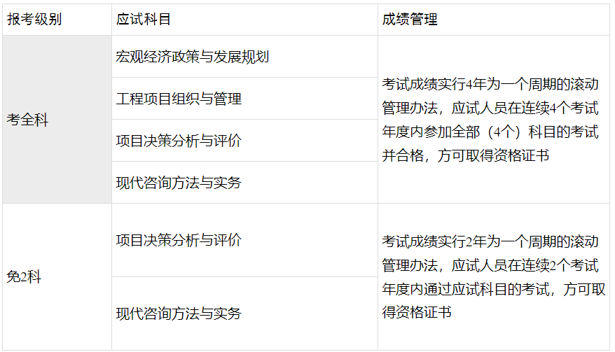 (二)凡符合《暫行規(guī)定》規(guī)定的考試報名條件,并具備下列一項條件者,可免試《宏觀經(jīng)濟政策與發(fā)展規(guī)劃》《工程項目組織與管理》科目,只參加《項目決策分析與評價》《現(xiàn)代咨詢方法與實務(wù)》2個科目的考試。參加2個科目考試的人員,須在連續(xù)的2個考試年度內(nèi)通過應(yīng)試科目的考試。