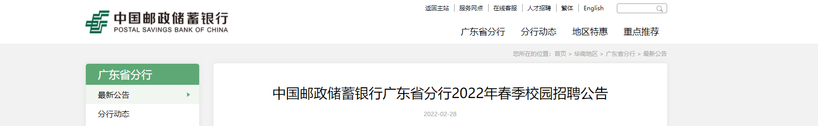 2022郵政儲(chǔ)蓄銀行廣東分行春季校園招聘若干人,報(bào)名時(shí)間:2022年4月3日24點(diǎn)截止,現(xiàn)將招聘公告原文發(fā)布如下: