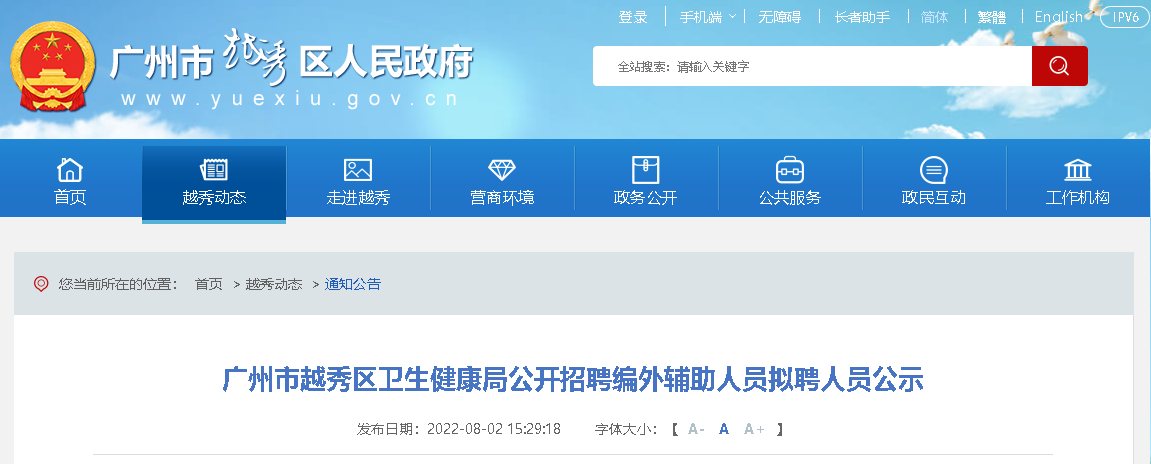 2022廣東廣州市越秀區(qū)衛(wèi)生健康局招聘編外輔助人員擬聘人員公示已出,公示時(shí)間:2022年8月2日至8月8日,現(xiàn)將招聘公示原文發(fā)布如下: