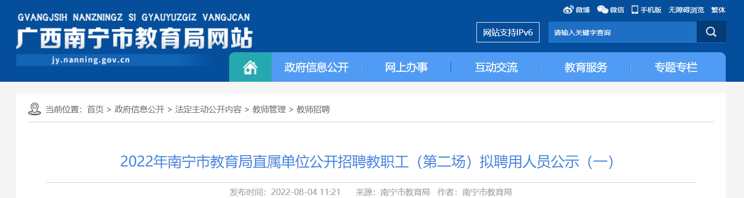 2022年廣西南寧市教育局直屬單位公開招聘教職工(第二場)擬聘用人員公示(一)已發(fā)布,公示時間:2022年8月4日-8月10日。現(xiàn)將原文發(fā)布如下: