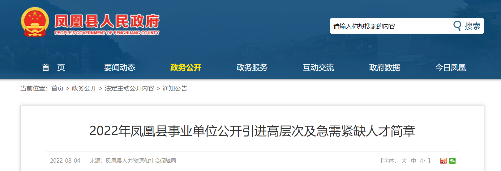 公開引進高層次及急需緊缺人才信息通過鳳凰縣人民政府門戶網(wǎng)站面向社會公開發(fā)布。