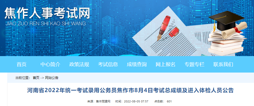 2022年河南省統(tǒng)一考試錄用公務員焦作市8月4日考試總成績及進入體檢人員公告已公布,為了方便廣大考生的查閱,下面為您詳細介紹一下本次公務員考試總成績及進入體檢人員的具體事宜,希望廣大考生及時關(guān)注,如有相關(guān)疑問,請關(guān)注公務員頻道為您實時做出的更新。