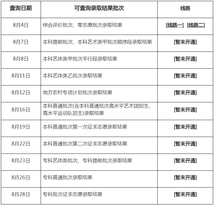 2.各批次錄取結(jié)果查詢具體時間原則上為上表查詢?nèi)掌诋?dāng)晚,如招生院校反饋錄取結(jié)果及時,錄取進(jìn)展順利,查詢系統(tǒng)可能會相應(yīng)提前開通。