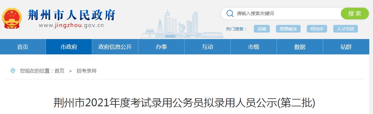 根據(jù)《湖北省2021年度省市縣鄉(xiāng)考試錄用公務(wù)員工作實施方案》,經(jīng)筆試、面試、體能測評、體檢和考察等環(huán)節(jié),現(xiàn)將荊州市2021年度考試錄用公務(wù)員擬錄用人員(第二批)予以公示,公示時間為5個工作日。(具體名單點擊查看)