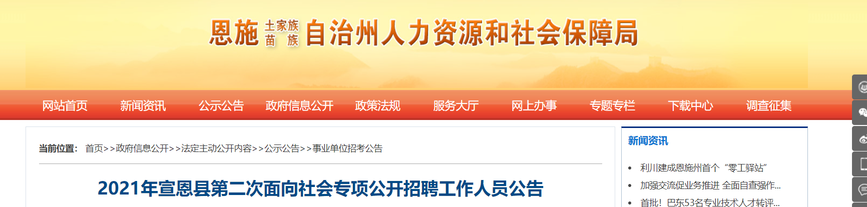 招聘公告在恩施州人力資源和社會保障局(http://rsj.enshi.gov.cn)面向社會公布,并在宣恩縣人民政府(http://www.xe.gov.cn/)進(jìn)行轉(zhuǎn)載。
