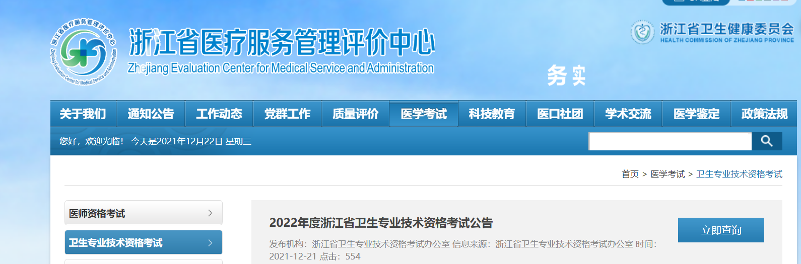 從浙江省衛(wèi)生健康委員會(huì)獲悉,2022年浙江衛(wèi)生專業(yè)技術(shù)資格考試公告已公布,報(bào)名時(shí)間為2021年12月20日-12月30日,具體詳情如下: